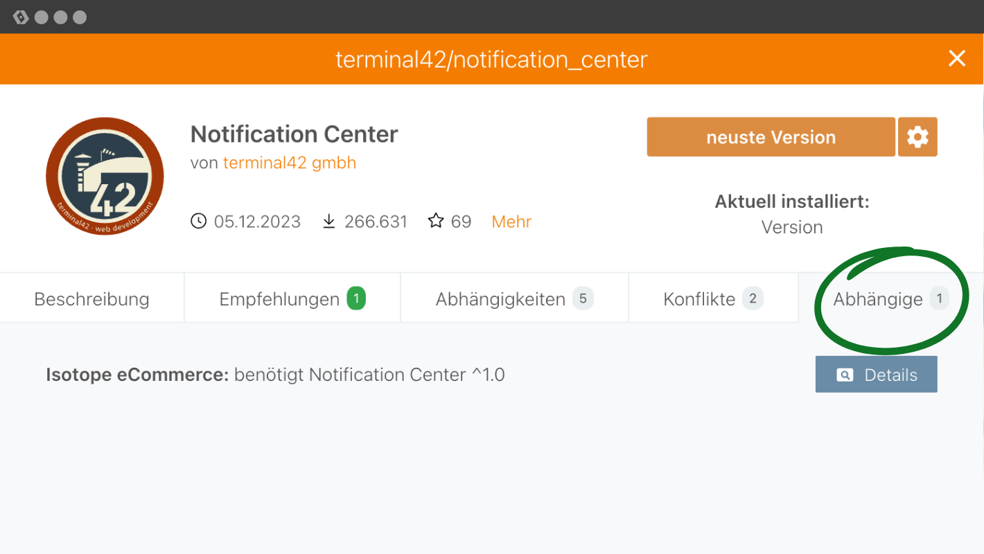 Du kannst z. B. den Contao Manager starten, dir das Paket Notification Center suchen und dort dann auf den Reiter «Abhängige» klicken.