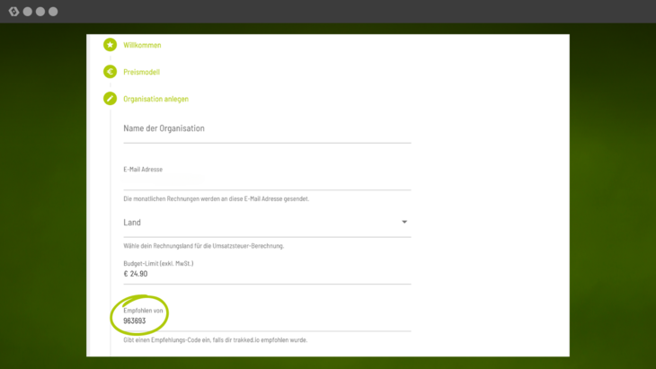 - Dein Freund registriert sich über deinen Link oder gibt beim Erstellen der ersten Organisation deinen Empfehlungscode ein