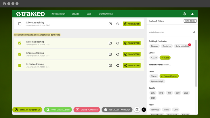 Angenommen, du hattest alle Contao 5.3.18-Installationen ausgewählt und auf «Updates installieren» geklickt. Nach erfolgreichem Update sind die Installationen auf 5.3.19 aktualisiert worden, aber aufgrund des Filters für die Version 5.3.18 wurden sie nicht mehr in der Liste angezeigt. Die Installationen waren allerdings weiterhin über die Mehrfachauswahl selektiert.