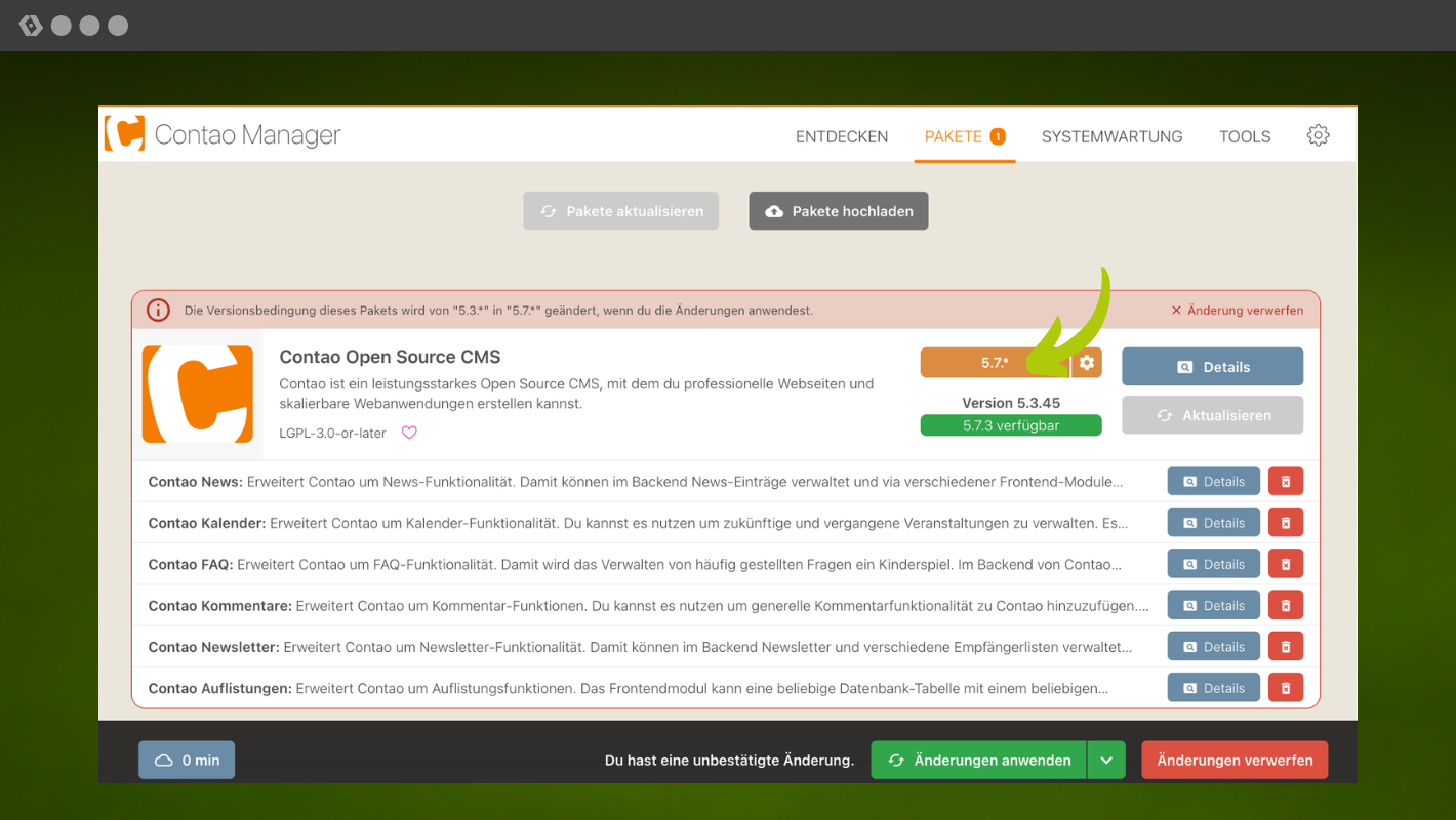Prüfe ausserdem, ob einzelne Erweiterungen eine Versionsanpassung benötigen. Das ist zum Beispiel dann der Fall, wenn eine neue Major-Version einer Erweiterung vorliegt. Starte danach das Update über den Contao Manager («Pakete aktualisieren») oder direkt über Composer.