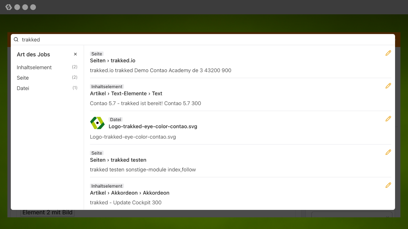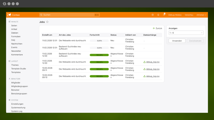 Das bereits in Contao 5.6 eingeführte Job-Framework wurde kräftig ausgebaut. Der Fortschritt laufender Prozesse ist jetzt überall im Backend und auf der Job-Liste direkt sichtbar. Entwickler und Entwicklerinnen können Anhänge wie Logs oder Reports zu den Jobs hinzufügen. Ausserdem wurde die bisherige Crawler-Implementierung zur Indexierung des Suchindexes vollständig auf das Job-Framework umgebaut.