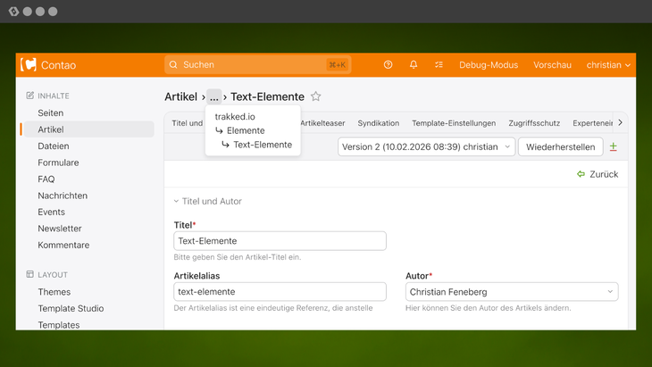 Wie gewohnt stehen dir bei trakked alle Funktionen auch für Contao 5.7 zur Verfügung. Zeitgleich mit der neuen Contao-Version wurde auch eine neue Manager-Version veröffentlicht, welche für trakked-Kunden bereits automatisch aktualisiert wurde.