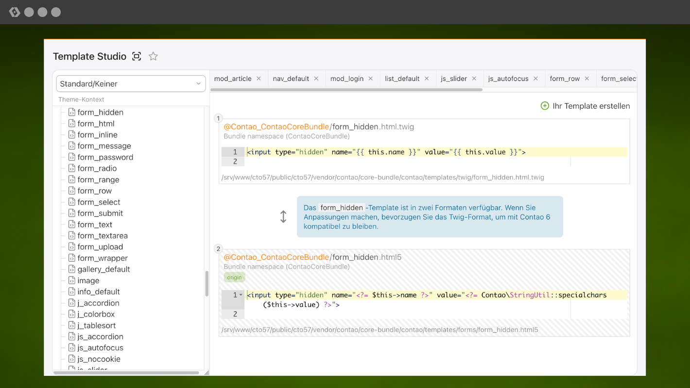 - Anzeigen beider Formate: Twig-Templates und HTML5, sofern vorhanden