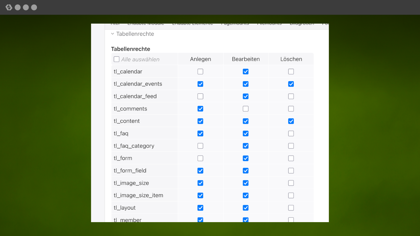 Mit den neuen DCA-Berechtigungen kannst du genau festlegen, welche Rechte (Erstellen, Bearbeiten, Löschen) ein Benutzer pro Tabelle hat. Das gibt dir noch mehr Kontrolle über die Zugriffsrechte in deinen Projekten. Ausgenommen sind Artikel und Seiten, diese werden weiterhin über die Einstellungen auf der Seitenstruktur gesteuert.