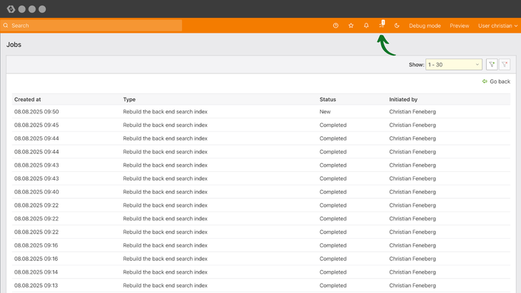 A new framework has been created for the management and display of jobs. This allows you to better understand processes that happen in the background (such as rebuilding the search index) and to view errors or progress of these processes directly in the back end in the future.