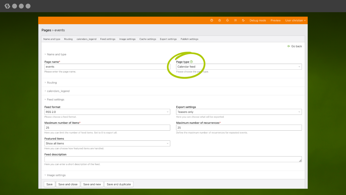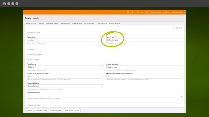 Similar to the page type for news feeds, there is now also a page type for calendar feeds. This means that you no longer have to configure the feed via the events archive, but can use your own page type. Existing feeds are migrated automatically.