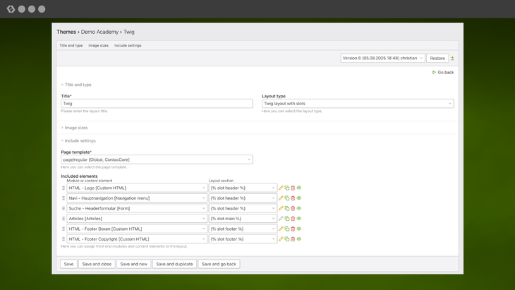 to define the individual sections to which articles or content elements can then be added. This means that you can only select the slots that the template actually provides. Stylesheets, JavaScript files and other assets can also be added directly via the Twig template and corresponding Twig functions.