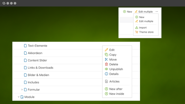In addition, the menu is now also available for global operations. This means that the most important functions are immediately visible, while the rest is only displayed after clicking on the three dots. The context menu alone makes it worth taking a look at the Contao 5.6 back end.