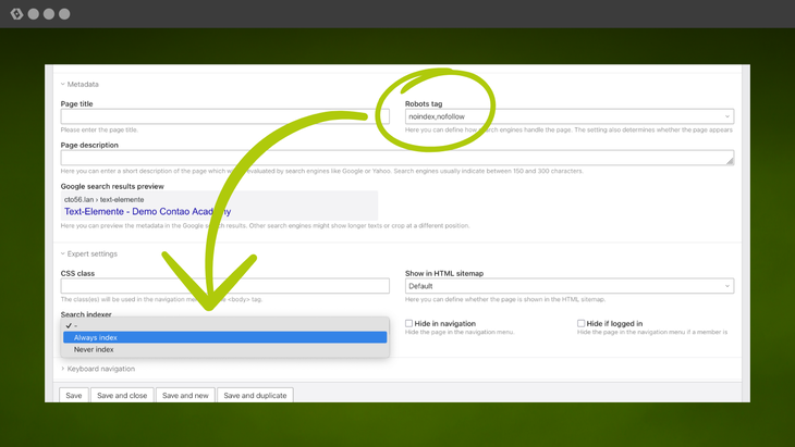 In the page settings, you can now specify whether the search indexer should always or never index a page, regardless of the meta robots tag. Previously, you could already exclude a page from the Contao search, but release it for public search engines. Now the reverse is also possible!