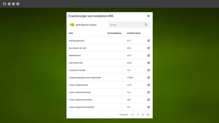 In the list of installed extensions you can now also see all the dependencies. For example, you can check which version of the package "symfony/framework-bundle" is installed.