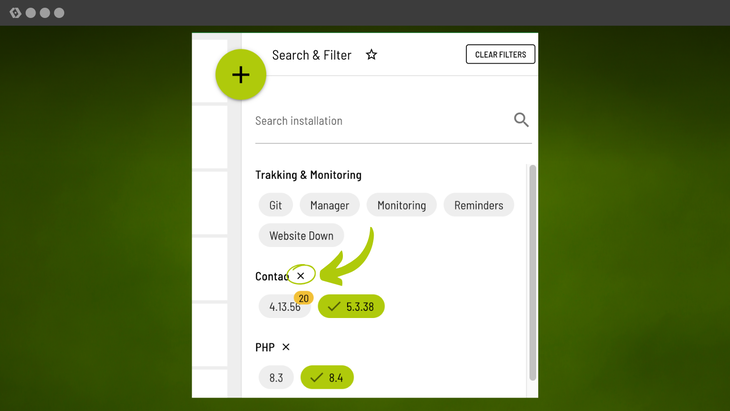 From now on, individual groups of filters can also be reset. For example, you can reset only the Contao version group while all other filters remain active. There is now a small X next to each group for this purpose.